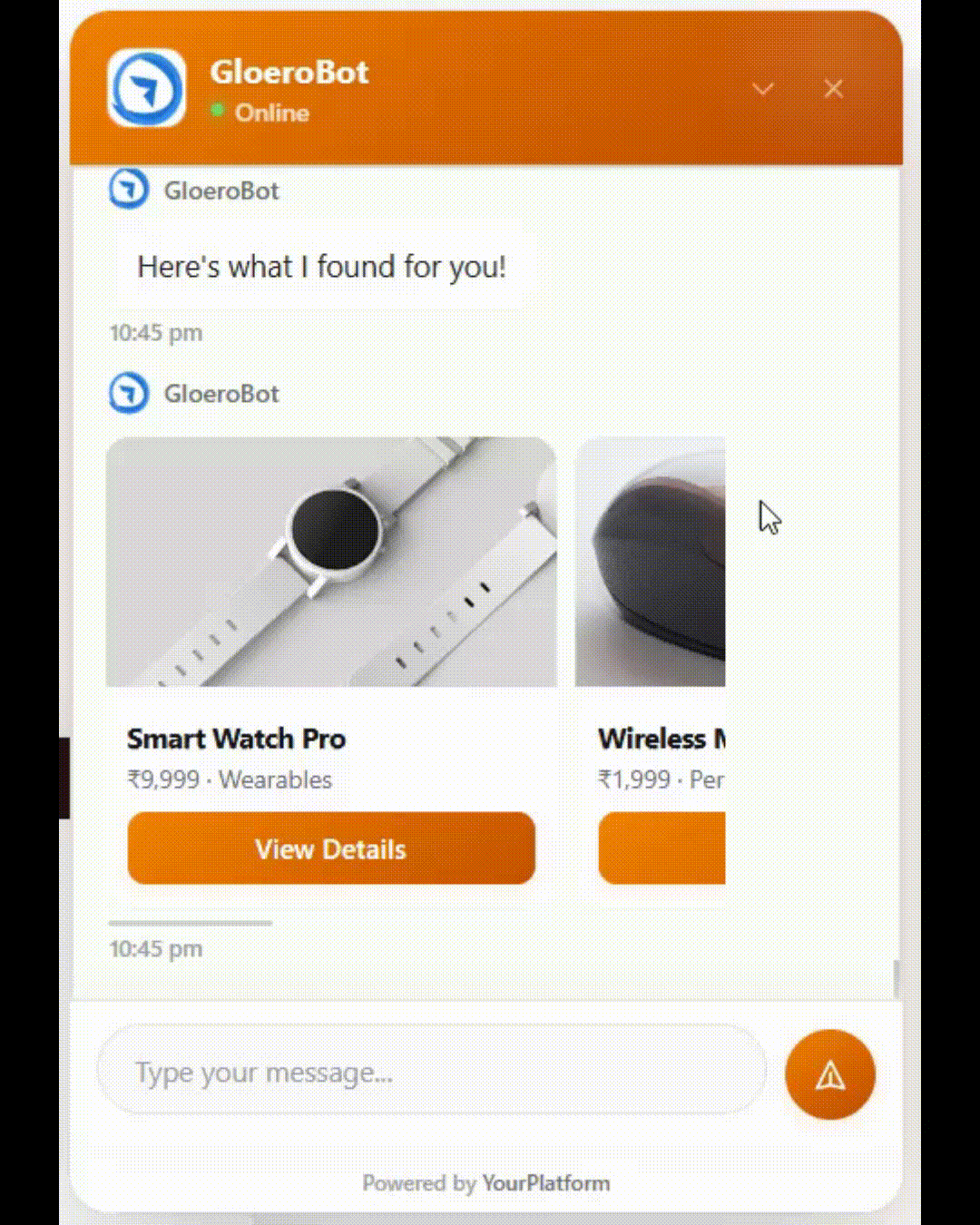 Real-time support, in-chat product discovery, lead capture, and powerful analytics — all powered by AI and deployed with a single line of code.
